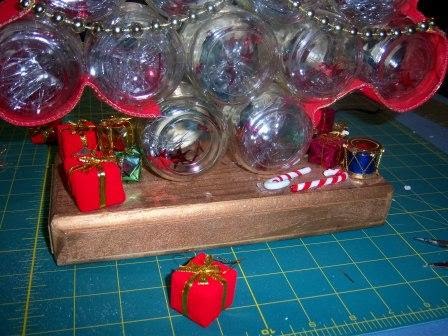 Take your miniature Christmas decorations and glue them around the bottom of the tree.