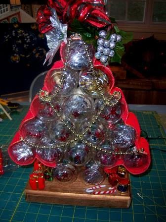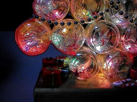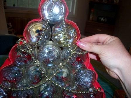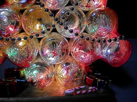 Because I do not have an unassembled tree, you’ll have to work with me here. The next step is putting the lids on all the jars and then using the epoxy to glue the jars into a tree shape as below.