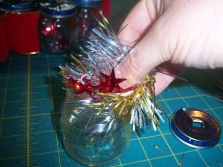 Choose what color of garland you would like to put inside the jars and cut about 2″ pieces to add to the jar. Remember that there are so many options here. All silver garland with blue lights is awesome, so is gold with white lights. I used silver garland and red stars garland and multi-colored lights. The possibilities here are endless. Just remember not to fill up the jar entirely. You want to be able to see the lights.