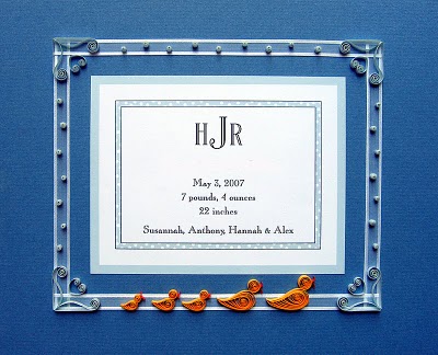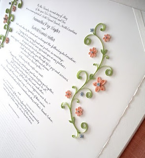Ann: Marriage certificates are my newest favorite. Originally a Quaker tradition, they’re a wedding trend that has been getting a good bit of online attention since I showed a quilled version on my blog. A couple’s vows are written in calligraphy on a poster-sized board, and then I embellish the piece with quilling, usually a floral design. The bride and groom signs the document at their wedding, as do all of the guests, and it’s later framed and hung in their home.