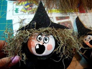 I stole a handful of spaghnum moss out of one of my silk flower arrangements and using the hot glue, glued small amounts onto each witch for hair. This is an incredibly messy step. I ended up with moss all over me and my worktable. But is makes great witch hair. Cut out three witch hats from your black craft foam and glue them onto the top of each witchy head. Add cheeks by mixing a drop of red with the white and adding to the witches faces.