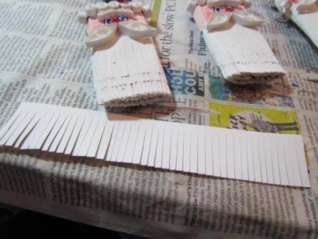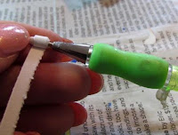 His hair is created by cutting a 1 1/2″ thick strip of white paper. Using scissors, cut a fringe, stopping the cut at about 1/8″ from the top. Glue this fringe at the top of the metal piece on the paintbrush, starting with one side of his face and working your way around the back, to the other side of the face. Once the glue has dried, you can use your quilling tool to curl the individual strips of hair.