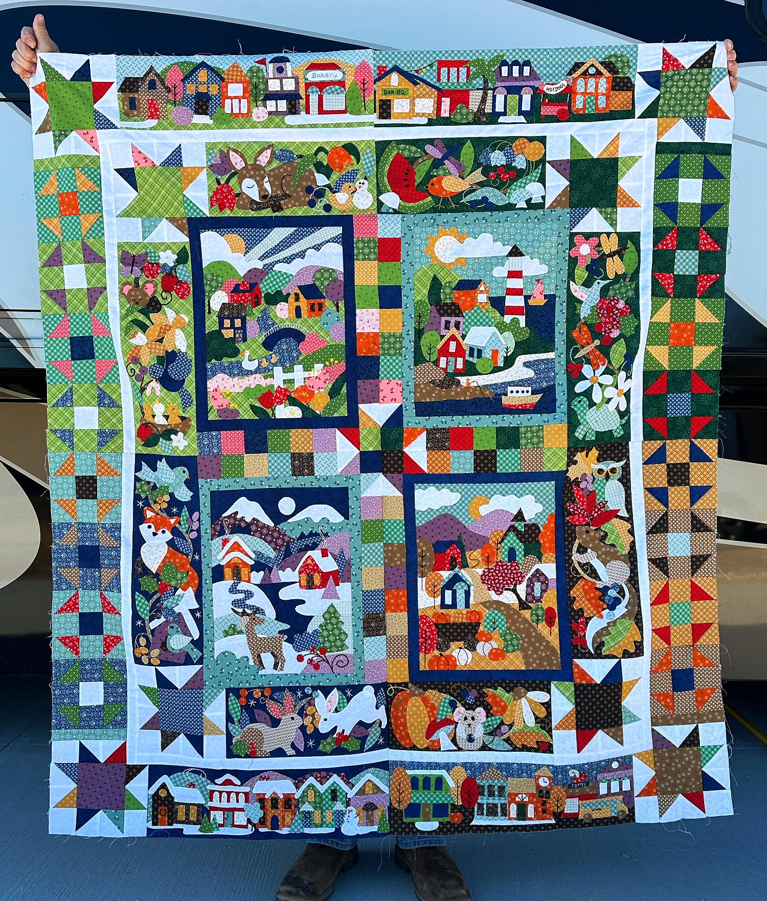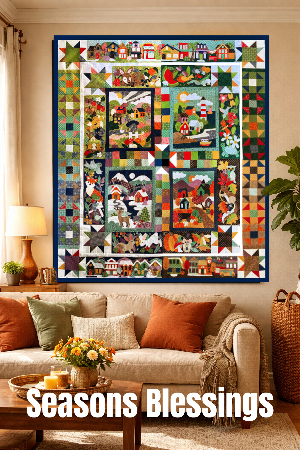 Celebrate the magic of the year in stitches with Seasons Blessings. Each quadrant of the quilt captures a different season, brought to life through whimsical appliqué scenes filled with sweet animals, cozy village details, and seasonal flowers.